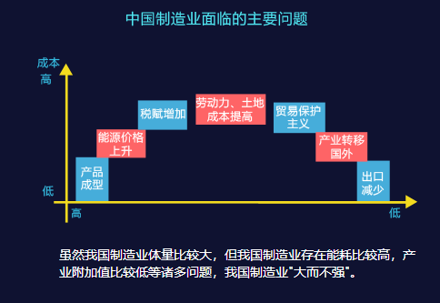 雖然我國制造業(yè)體量比較大,但我國制造業(yè)存在能耗比較高,產(chǎn)業(yè)附加值比較低等諸多問題。近年來,能源價格上升、勞動力和土地成本的提高等一系列問題正逐漸擠壓中國制造業(yè)的利潤空間,總體而言,我國制造業(yè)“大而不強(qiáng)”。